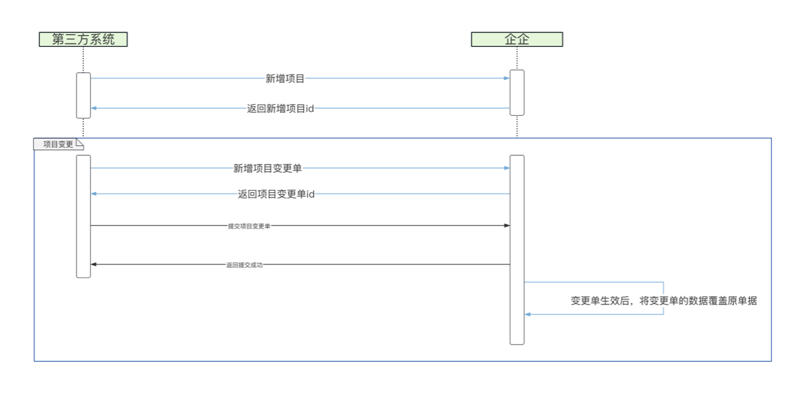 本教程通过 API 实现企企已生效单据的变更,操作时序图如下所示: