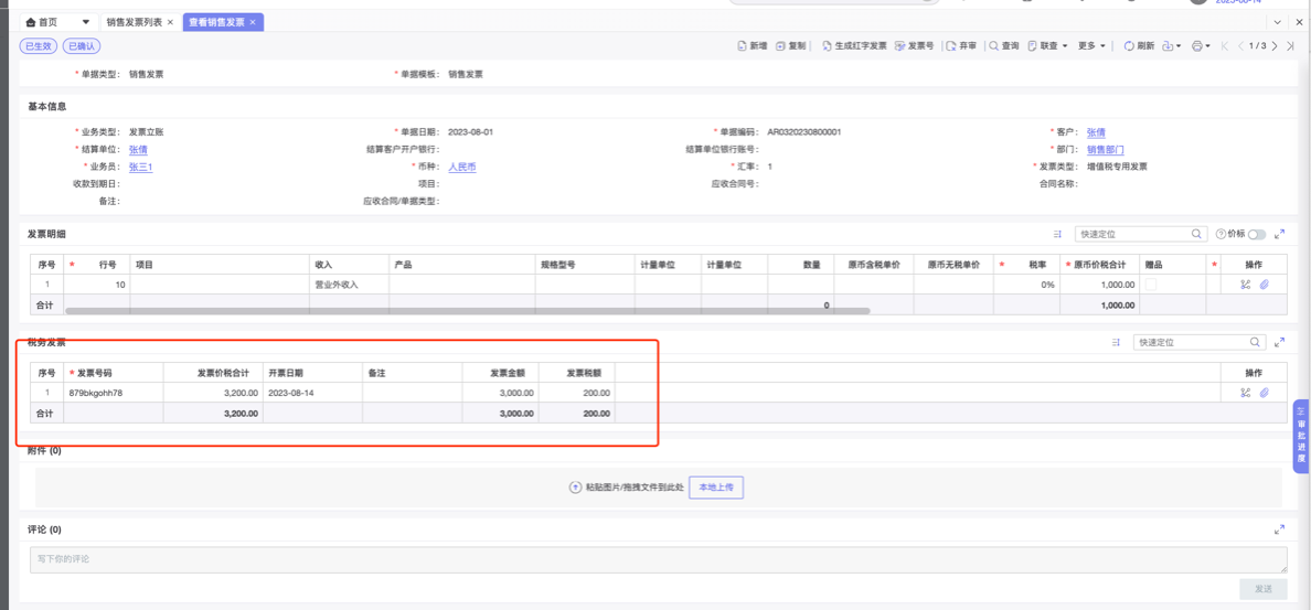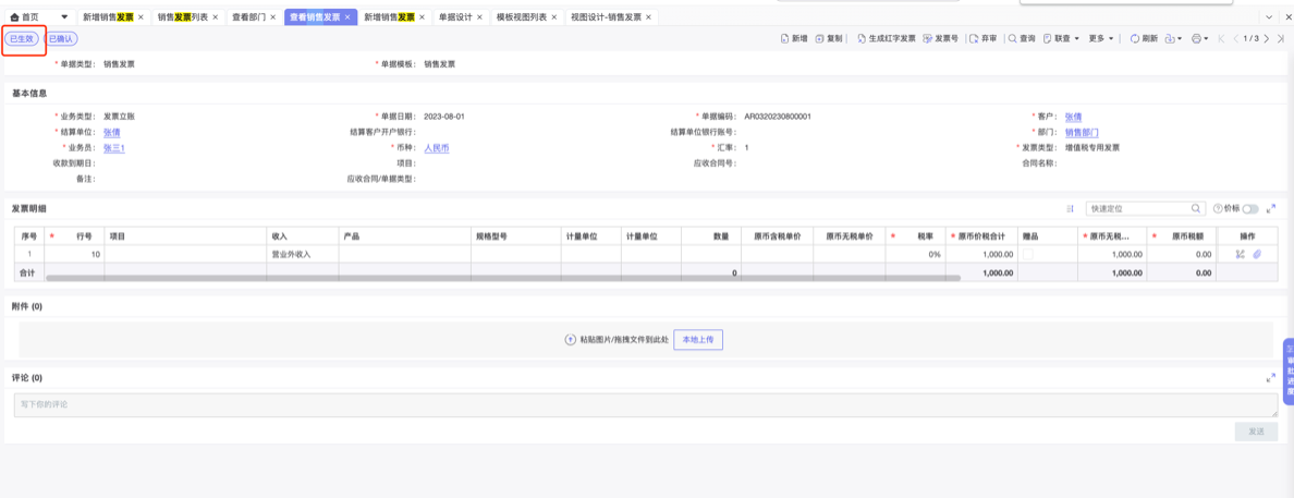 在企企中新增销售发票如下,且单据已生效: