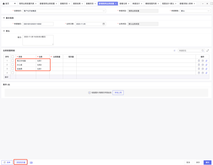 步骤1、新增自定义单据,明细表选择存货,仓库,然后点击左下方的获取现存量按钮,即可触发前端脚本。