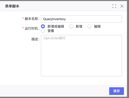 3、 在智元平台,字段与对象->自定义对象->创建前端脚本QueryInventory,运行时机选择:新增或编辑