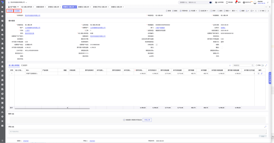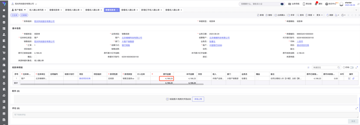 步骤3:收入确认单生效后,自动生成收款单,且收入确认单状态变为已收款