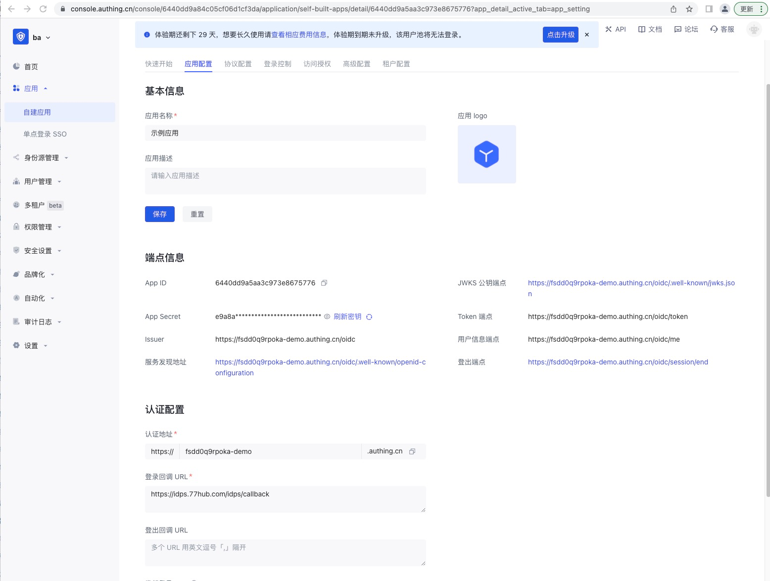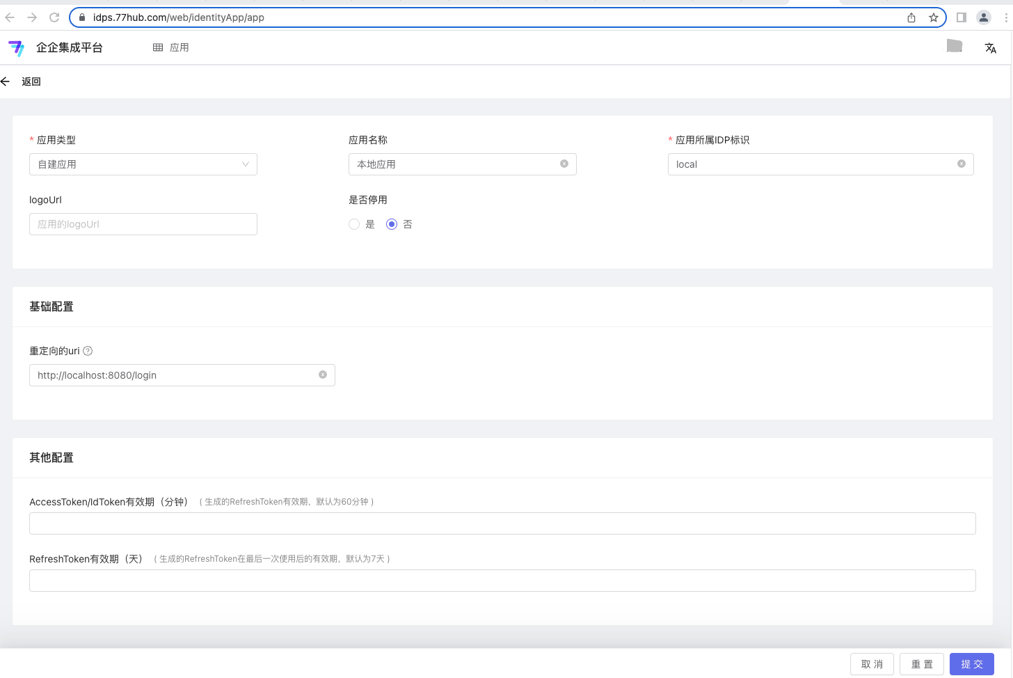- 应用所属IDP标识: 在idps中的唯一标识,要求为英文字母开始,标识当前自建应用,比如: testapp1