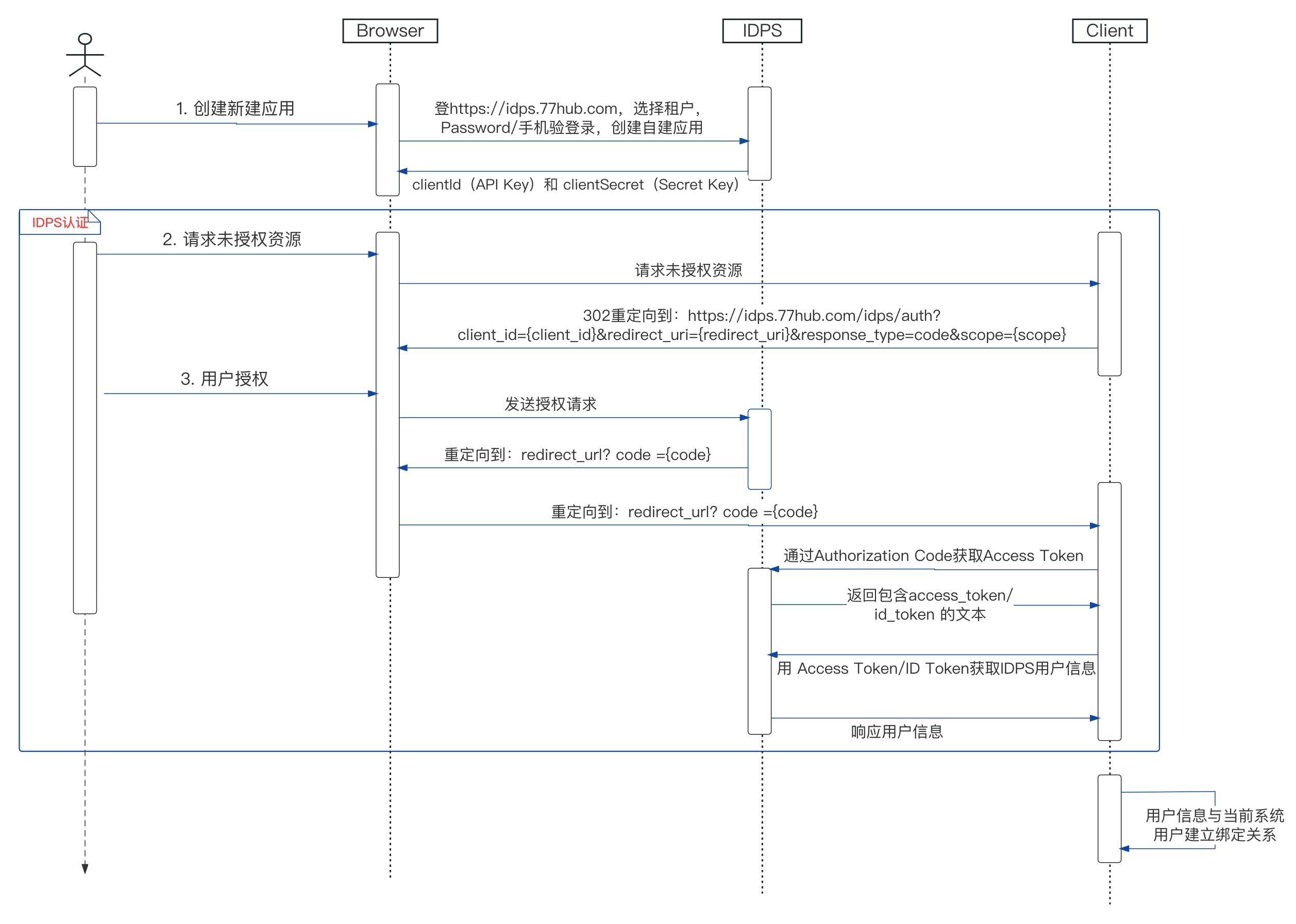 第三方系统需要将从步骤二2.3获取的用户信息与当前系统用户建立绑定关系, 下次在通过IDPS进行认证时,回调取得用户信息,找到绑定的用户,即可直接进入到第三方系统。